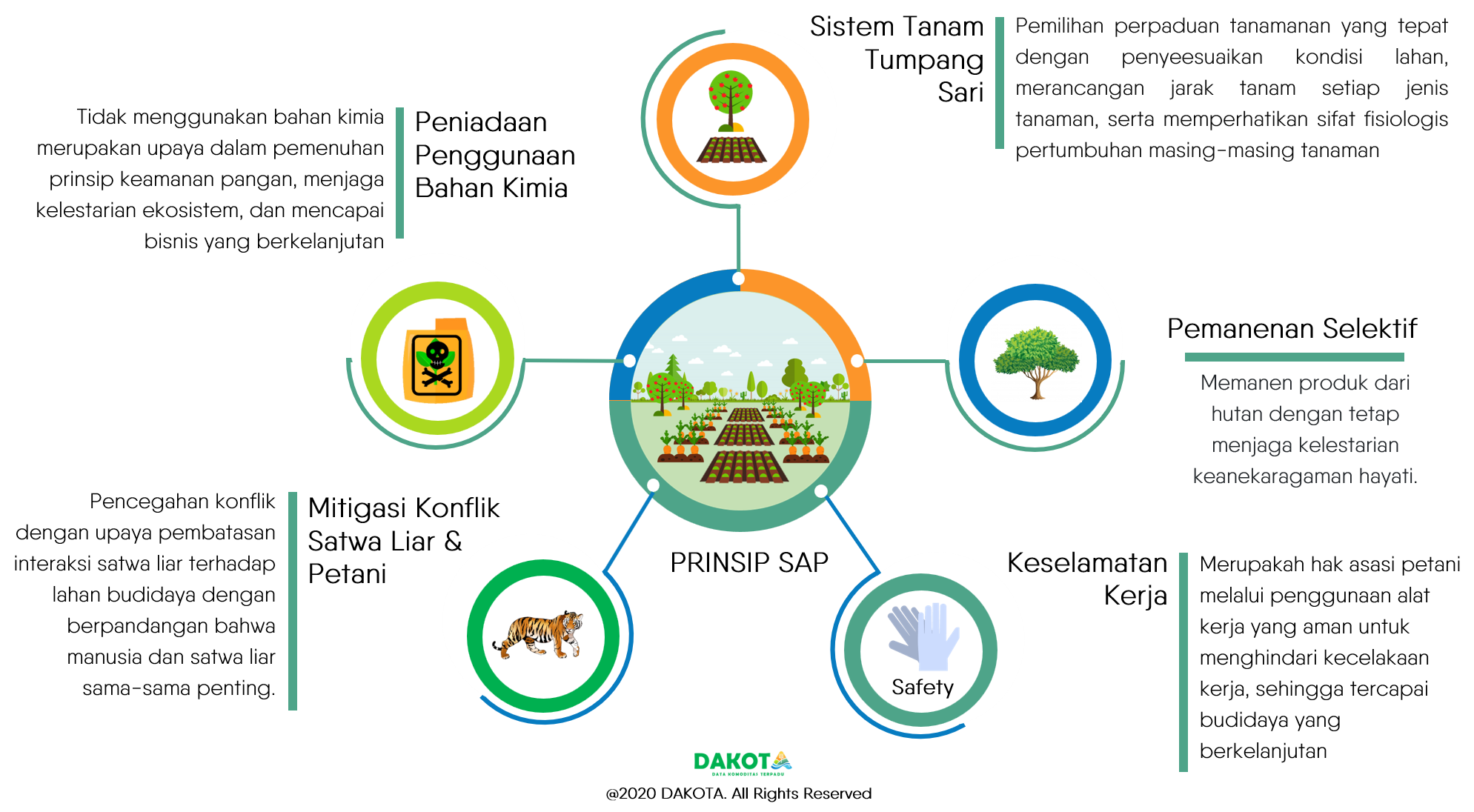 kearifan lokal, karena bercocok tanam dengan kondisi-kondisi lingkungan, sosial-ekonomi, dan budaya setempat. Selain aspek sosial-ekonomi, yang menjadi tujuan utama SAP adalah aspek lingkungan. Beberapa aspek lingkungan SAP yang baik yaitu proses tata air (hidrologi), menjaga dan meningkatkan konservasi flora dan fauna yang ada didalamnya, maupun konservasi terhadap air dan tanah yang menjadi habitatnya, meningkatkan layanan ekosistem, penyerapan karbon, dan ketahanan iklim. Beberapa prinsip yang perlu diperhatikan dalam penerapan SAP agar terjadi optimalisasi budidaya komoditas dilhat dari perspektif sosial-ekonomi dan lingkungan dijelaskan dalam gambar dibawah ini: